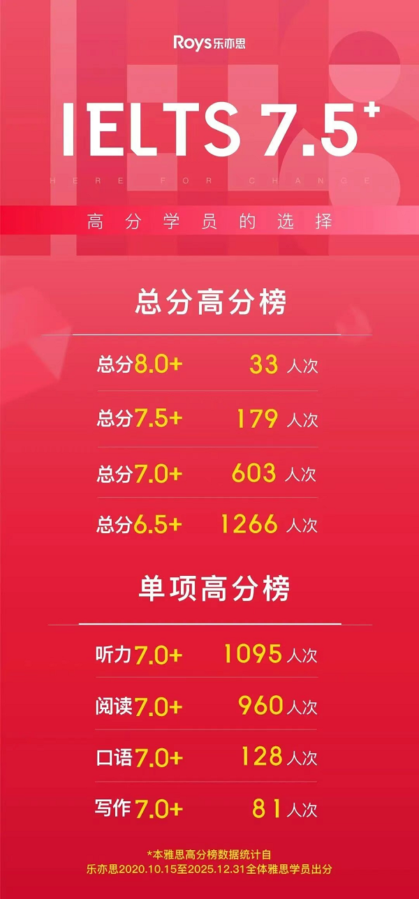 但在乐亦思,这种“死循环”其实早就被打破了。在这里,7分不是天花板,而是地板。光是总分7.0+的学员就已经突破了600人次,口写双7更是常态。