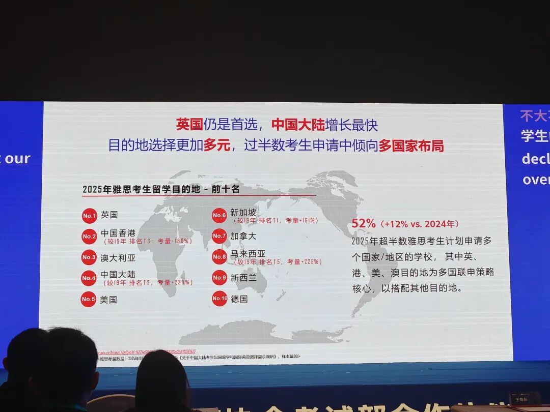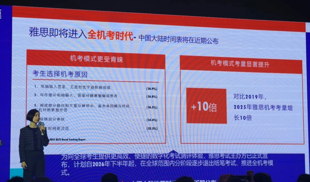 针对此前流传的中国大陆即将取消纸笔考试的消息,本次年会也给出了明确回应。雅思官方正式宣布,考试即将全面迈入机考时代,并详细阐述了机考的各项优势。与2019年相比,机考考量增长了10倍,其中杭州市和苏州市的考量增长尤为显著,分别上升了34%和53%。当然,北京和上海依然稳居考量排名的前两位。