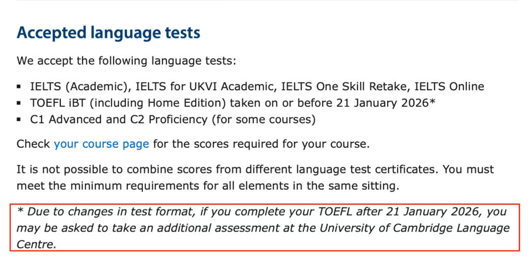 最新消息来啦!剑桥大学对2026年新托福的态度有了新变化,宣布“接受”啦!最近,剑桥大学研究生院更新了官网上的入学语言测试要求,补充了一条重要信息:2026年1月21日之后参加托福考试的同学,除了提交新托福成绩,可能还得参加剑桥大学语言中心的额外评估。