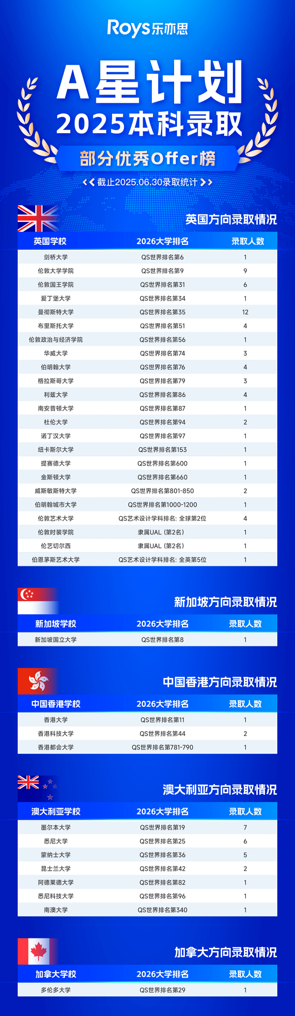 乐亦思A星计划,凭借着十余年的教育积累,已经助力25届学子斩获了无数本科录取offer。目前,我们已经收获了1枚剑桥、11枚G5、3枚港三、1枚新二以及78枚QS前100的录取佳绩!我们始终以学生为中心,开展“陪伴式教育”,为想要入读世界名校的学子提供1v1的升学规划方案、选课指导、国际课程和语言提升以及日常学习管理等“一站式”国际教育服务。