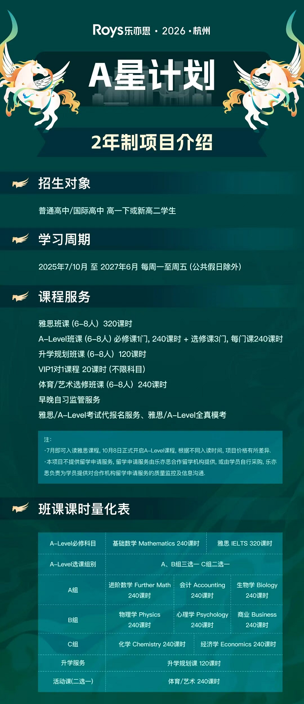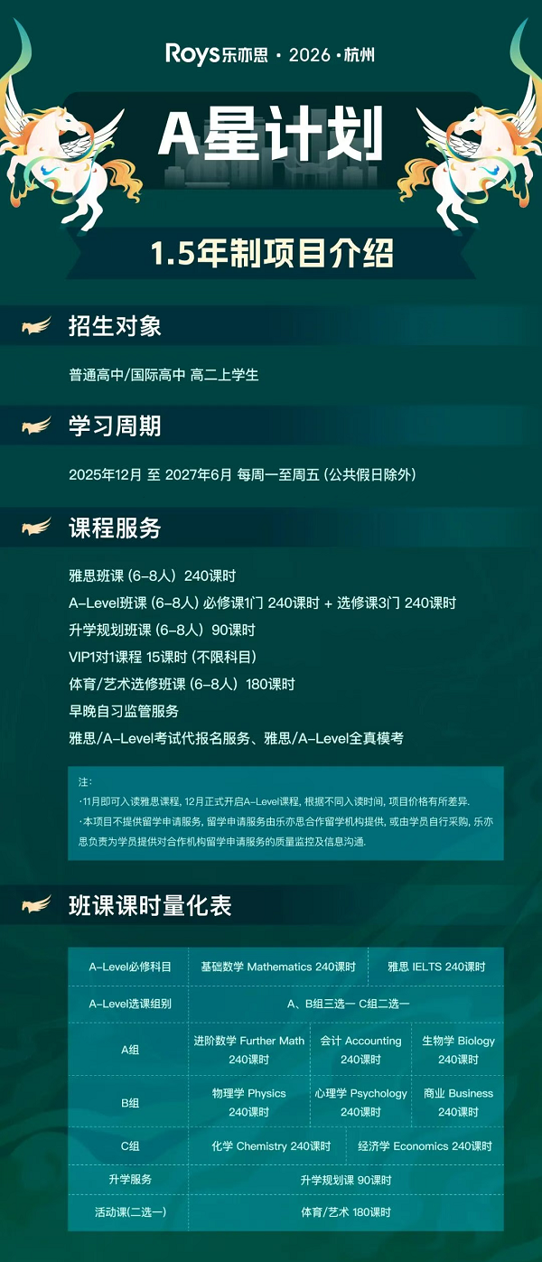 越来越多的家庭开始选择提早规划,为孩子的留学之路铺好基石。当申请季的钟声敲响,乐亦思A星计划已经蓄势待发,准备助力学子们冲刺梦想中的顶流院校!