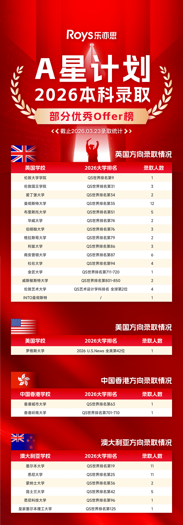 乐亦思,在教育领域深耕多年,积累了丰富的经验和深厚的底蕴。在过去的 26 届本科录取中,乐亦思那可是战果辉煌,捷报一个接着一个。总共斩获了 75 枚 QS 前 100 的预录取通知,这里面有伦敦大学、伦敦国王学院、爱丁堡大学、曼彻斯特大学,还有香港城市大学等世界知名学府。不管是英国、香港,还是澳洲、美国,乐亦思在各个主流留学方向都全面开花,成绩斐然。