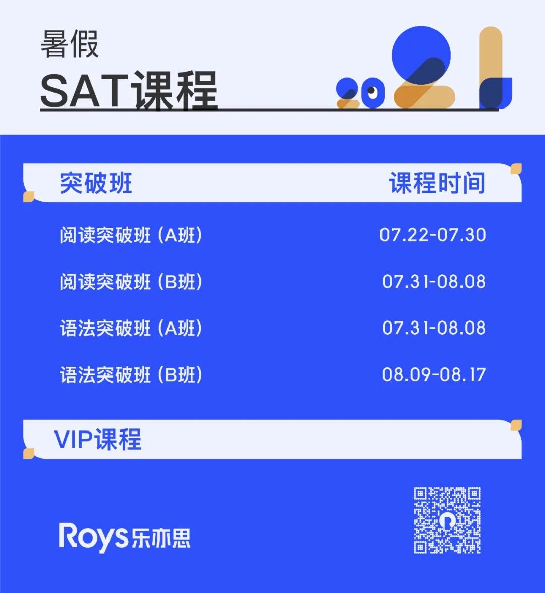 上周Roys乐亦思又开播了一期SAT直播讲座,关于暑假SAT课程的介绍以及回答了家长学生们若干个问题,一起来看看吧。1. Roys乐亦思暑假SAT全程班 主要针对托福90分以上的学生,Roy老师亲自授课,还有其它出色的SAT老师,乐亦思SAT团队持续投入教学研究,授课内容兼具系统性与丰富的细节。 Roys乐亦思SAT团全年教研时长超过1万小时,每一次教研都是针对教材进行了再一次全面的升级,乐亦思SAT课程每年会进行一到两次的教材和讲义的迭代