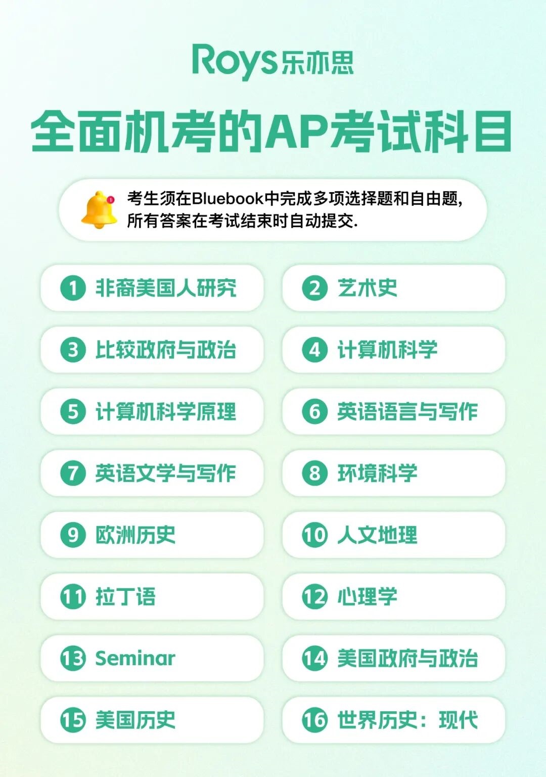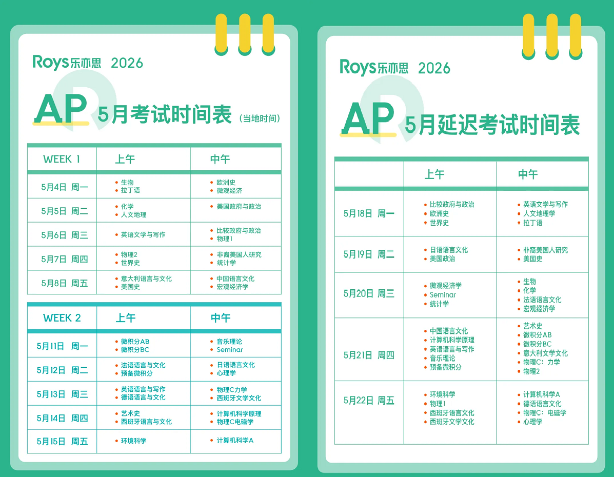 考试时间安排:正常考试5月4日至15日,为期两周;补考5月18日至22日(需提前申请);成绩发布7月初(College Board账号查询);成绩复议7月进行。