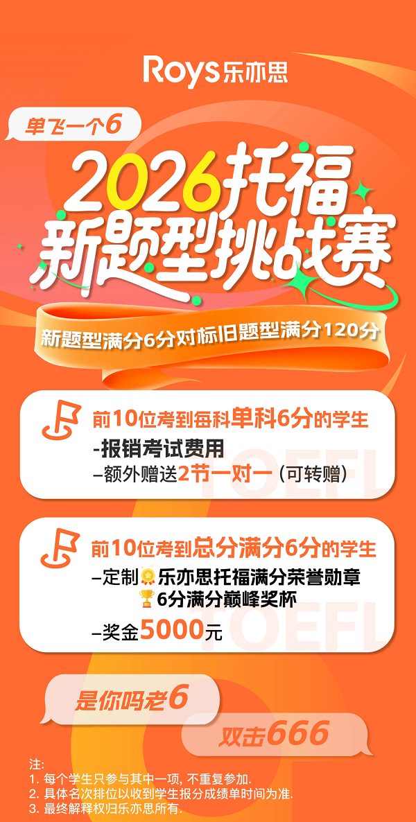 新题型6分锦标赛,5000元现金大奖等你来挑战!前10位考到任意单科6分的学生,报销考试费用,还额外赠送2节一对一课程;前10位考到总分满分6分的学生,更是能定制专属荣誉奖杯,还有5000元现金大奖等你拿!