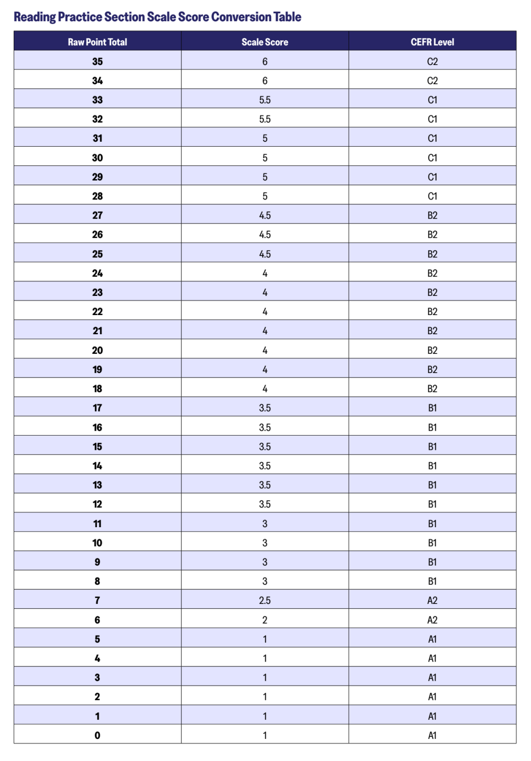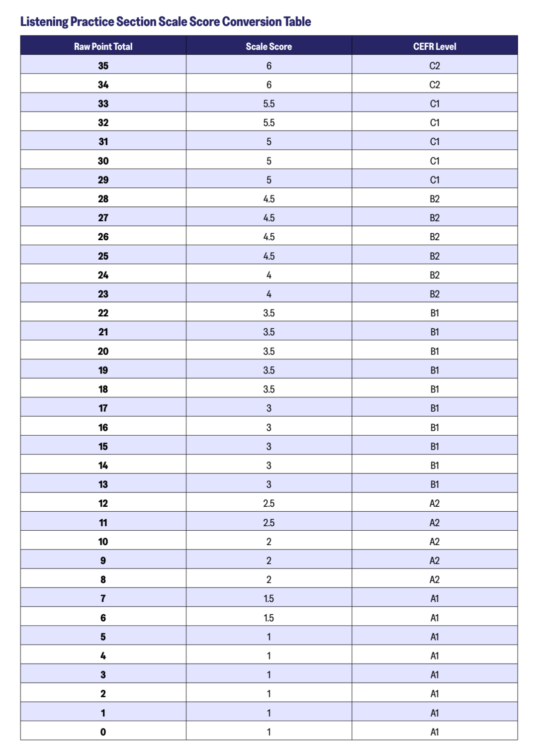 听力部分同样35题计入总分,每道题1分,加试的话其余12题不计入成绩。算出原始成绩后,根据表格换算成6分制成绩。从表格能看出,听力部分换算标准比阅读严格多了,尤其是高分段和B2等级段,容错空间小得可怜。