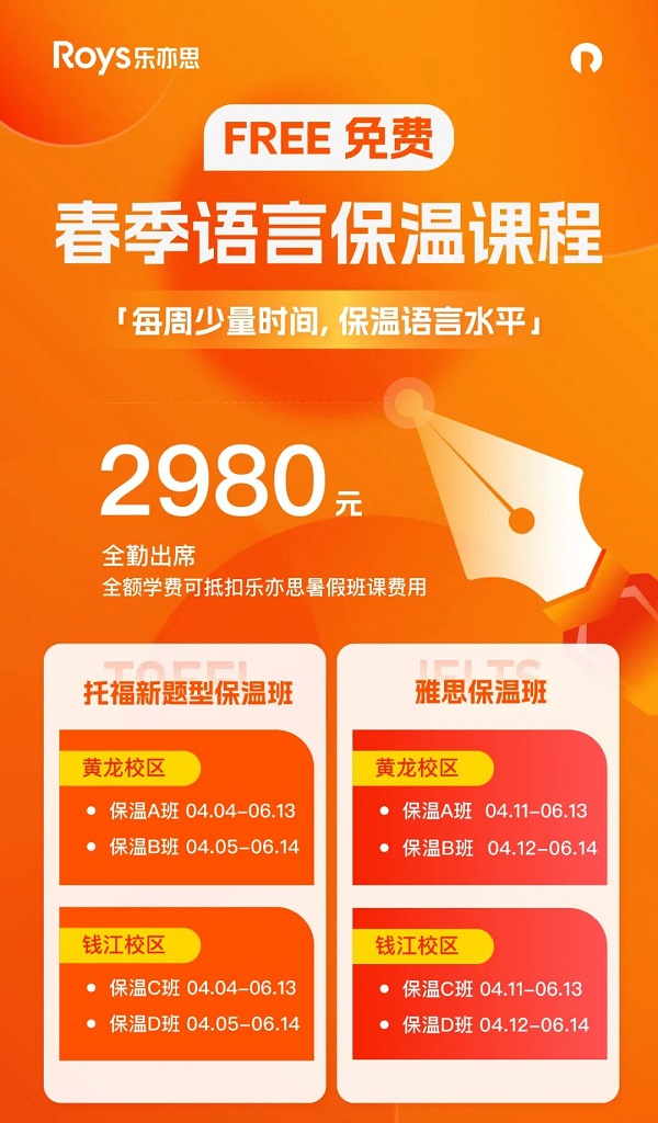 这个春天,别再浪费时间啦!每周末抽出少量时间,加入乐亦思保温班,让你的语言水平稳稳“保温”,为未来的高分冲刺积蓄力量!