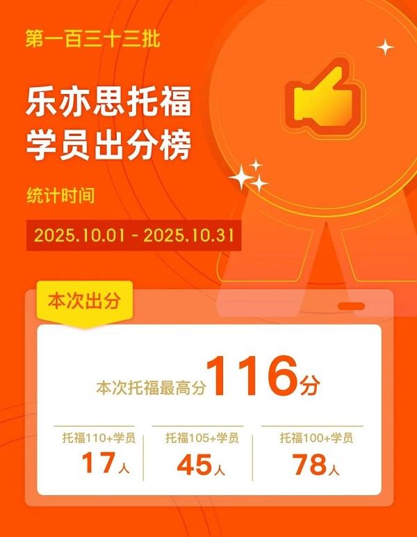 近日,乐亦思托福再次传来喜讯,高分学员如潮水般涌现!第133批出分榜新鲜出炉,最高分达到了惊人的116分!其中,托福110分以上的学员多达17人,105分以上的有45人,而100分以上的更是达到了78人!