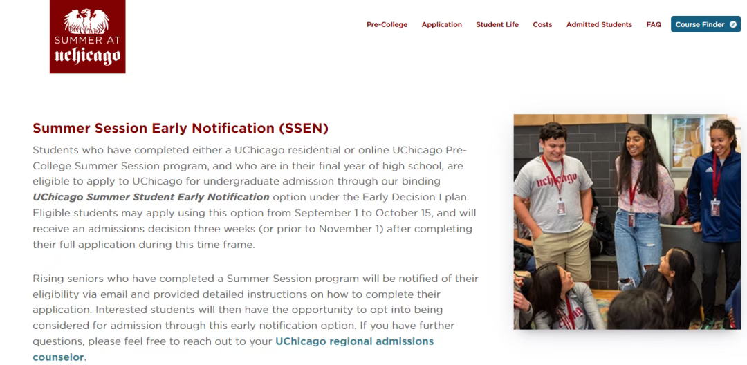 从2024年9月开始,只要参加过芝大的Pre-College Summer Session夏校项目,就有机会享受专属申请批次——Summer Student Early Notification(SSEN),即ED0。